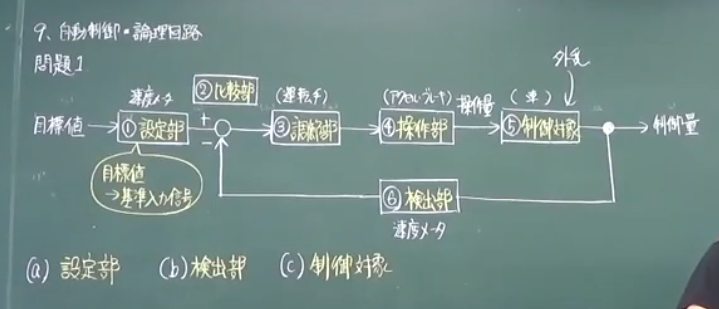 フィードバック制御系の各部のはたらきとして,空欄に適する語句を語群から選んで答えよ。また,説明に最も関連するものを語群から選んで答えよ。 【語群】調節部 設定部 比較部 検出部 制御対象 操作部