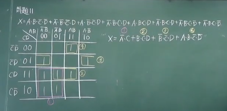 以下の論理式を簡単にせよ。 X = A・B・CD + ABC・D + A・BC・D + AB・C・D + A・B・C・D + A・B・C・D + AB・C・D + A・B・C・D