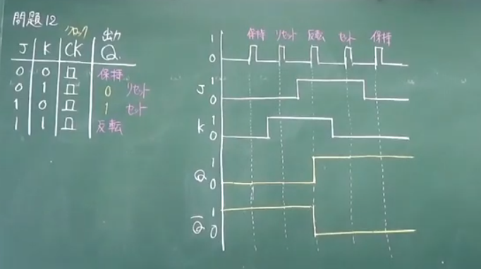 JKフリップフロップ回路において、図のような入力に対して、出力のQおよびQのタイムチャートはどのように表されるか。  <おすすめ記事> 電験3種 機械のおすすめの勉強先リンク