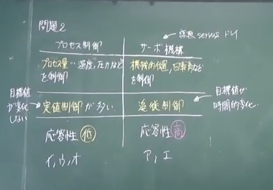 以下の項目ア~オは,プロセス制御,サーボ機構のどちらについて述べているか。どちらかに分類せよ。 ア.制御量が機械的位置,回転角などを主体とする制御である。 イ.制御量が温度,流量,圧力などを主体とする制御である。 ウ.定値制御が多い。 エ.目標値が時間とともに任意に変化する。 オ.応答性がかなり低い。