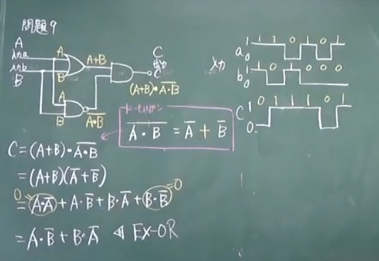 左図の論理回路において,入力a及び入力bに右図に示すような入力があるときの出力cのタイムチャートをかけ。