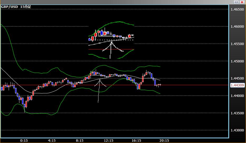 長めの足を下降トレンドと判断したので、エントリータイミングを探る戦いをしていました。白線のラインを下に割って陰線を確定させてのでエントリー。1/13日現在+10ppぐらいで保持中。